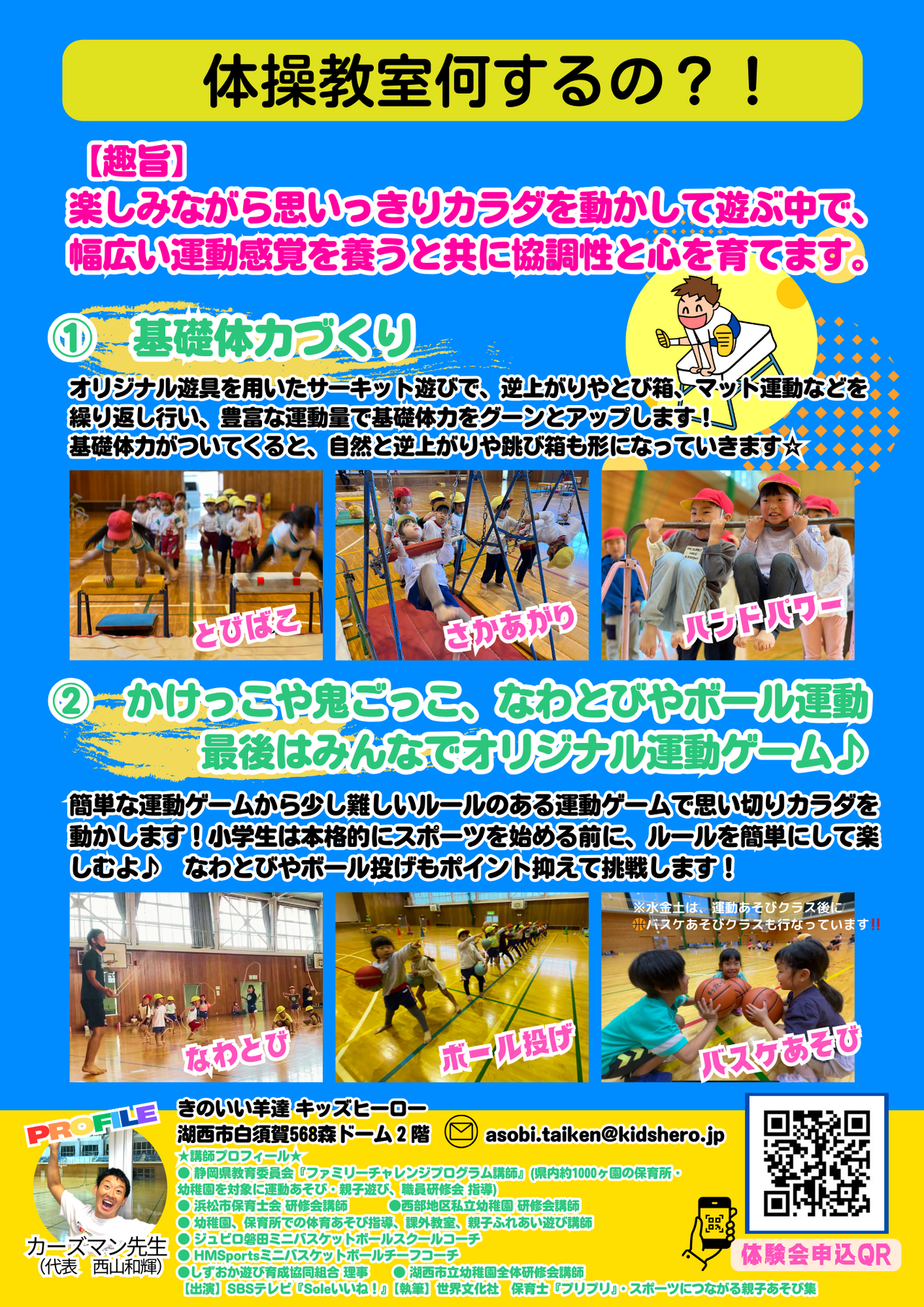 浜松市や湖西市を中心に、幼稚園や保育所、こども園や子育て支援サークル、児童会、子ども会などにて、乳幼児・児童を対象に体育あそび、親子あそび、バスケットあそびの指導をしています。